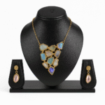 • A bold necklace featuring an asymmetric cluster of raw-cut stones in shades of aqua, violet, and pearly white, set in golden frames.
