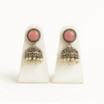 Each earring features a beautiful, smooth cabochon stone in a sophisticated dusty rose hue. This lovely centerpiece is set in an intricate, oxidized silver-tone stud, which leads down to a classic jhumka dome. The dome itself is adorned with detailed metalwork and fringed with a cluster of delicate cream-colored pearls, adding a touch of graceful movement and a classic finish.